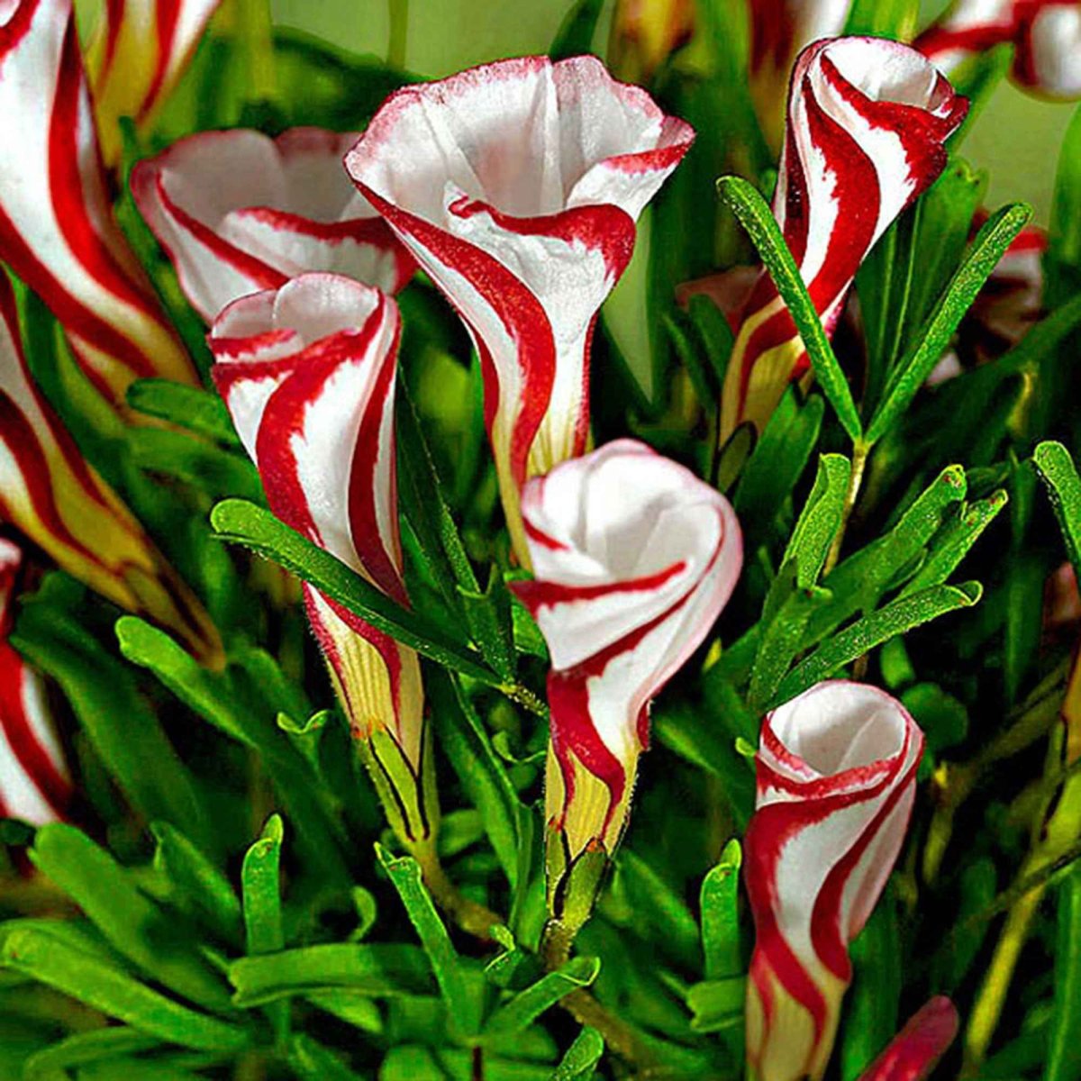 L’Oxalis versicolor se distingue par ses fleurs bicolores en spirale qui rappellent des bonbons rayés.