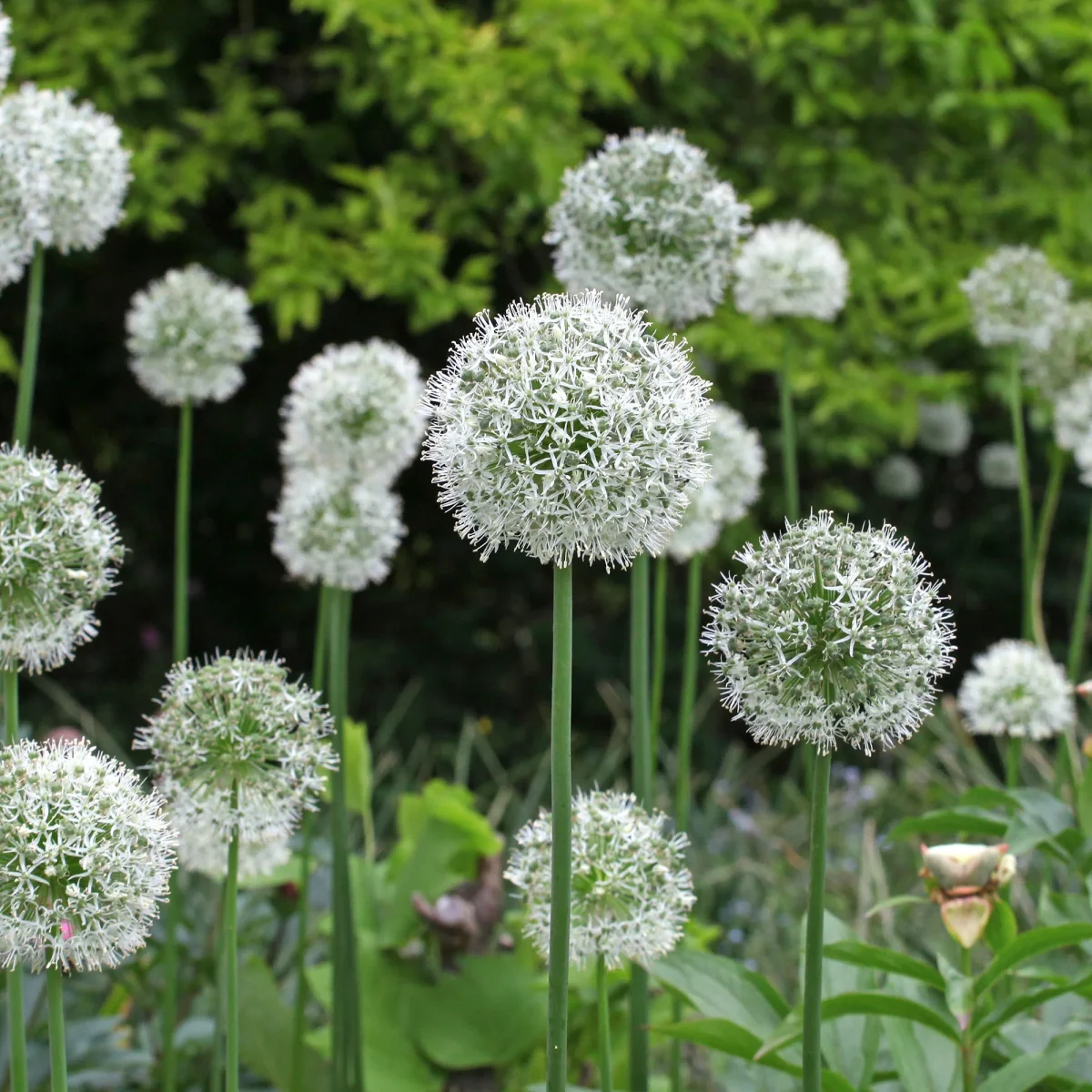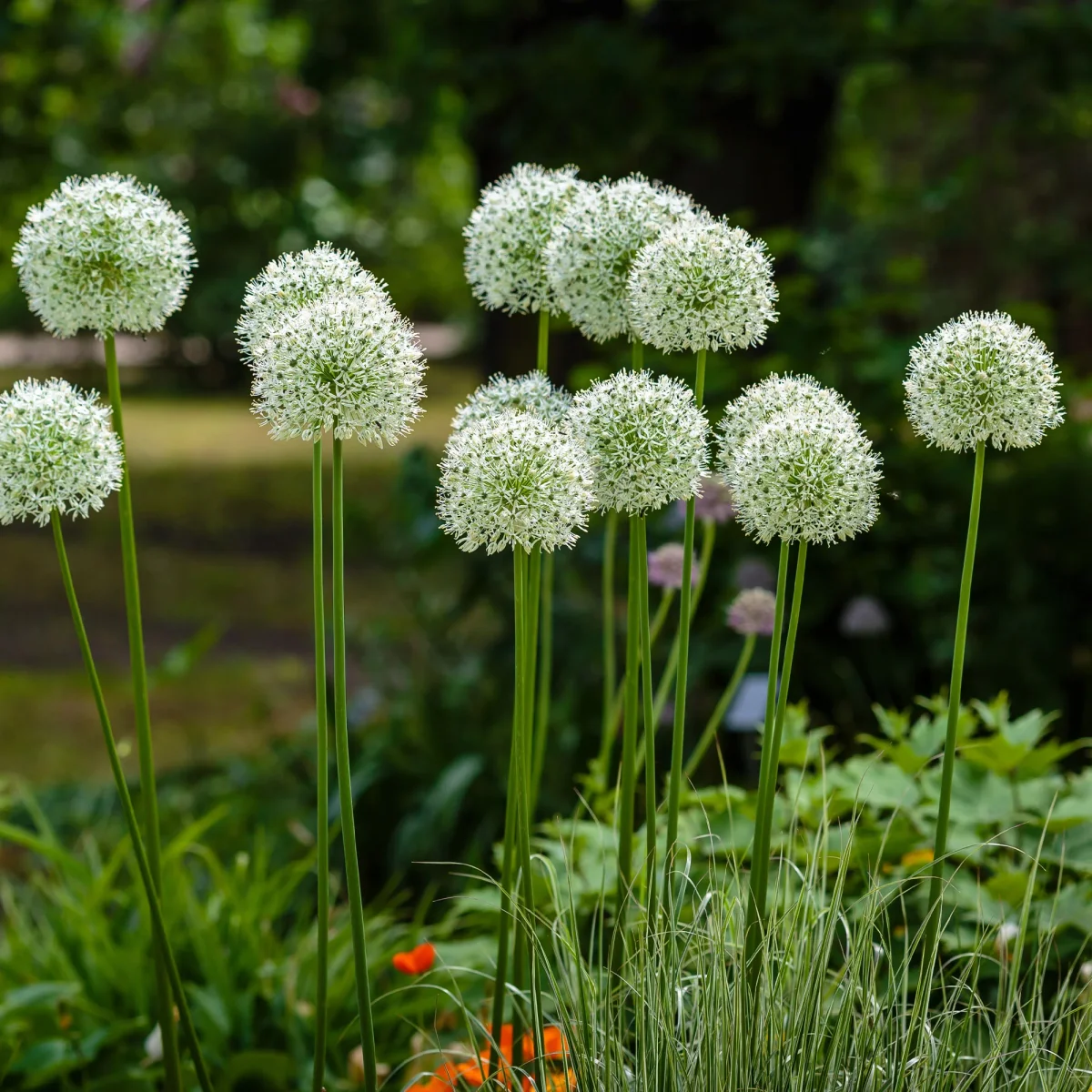 L’Allium Mount Everest, avec ses fleurs en forme de globes blancs immaculés, crée un spectacle visuel captivant lorsqu’il est associé à d’autres plantes. Planté près des vivaces aux teintes douces comme les Nepetas bleus ou les Geraniums roses, il offre un contraste saisissant. Dans un jardin de style cottage, l’association avec des Delphiniums aux tons bleus profonds et des roses anciennes apporte une élégance intemporelle. Pour un effet moderne, il peut être juxtaposé à des graminées ornementales comme les Miscanthus, qui accentuent sa structure verticale. En bordure de massifs, les petites fleurs jaunes d’Achillea ‘Moonshine’ complètent parfaitement sa hauteur et sa couleur, créant ainsi une harmonie de textures et de couleurs. Cette combinaison permet de jouer avec les hauteurs et les teintes, apportant ainsi dynamisme et diversité au jardin.