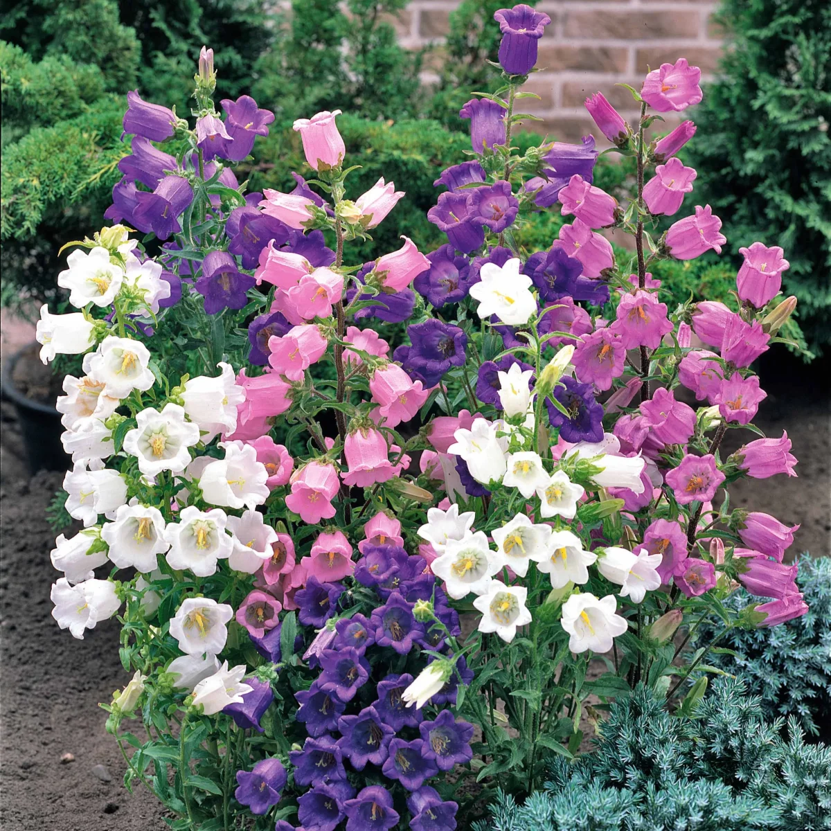 La Campanule Carillon en mélange se marie bien avec diverses plantes, créant des combinaisons harmonieuses dans le jardin. Par exemple, en l’associant à des fleurs vivaces comme les pivoines, lupins, iris et digitales, vous pouvez créer des bordures et des massifs riches en textures et en couleurs. Intégrée dans un jardin aromatique aux côtés de la lavande, sauge, thym et menthe, elle offre un effet visuel et olfactif captivant. Pour un intérêt saisonnier supplémentaire, combinez-la avec des annuelles telles que les soucis, cosmos et zinnias, assurant une floraison constante tout au long de l’été. Utilisée comme plante de fond pour des couvre-sols comme les campanules rampantes, géraniums vivaces et sedums, elle crée une transition douce entre différentes hauteurs de plantes et remplit l’espace de manière attrayante.