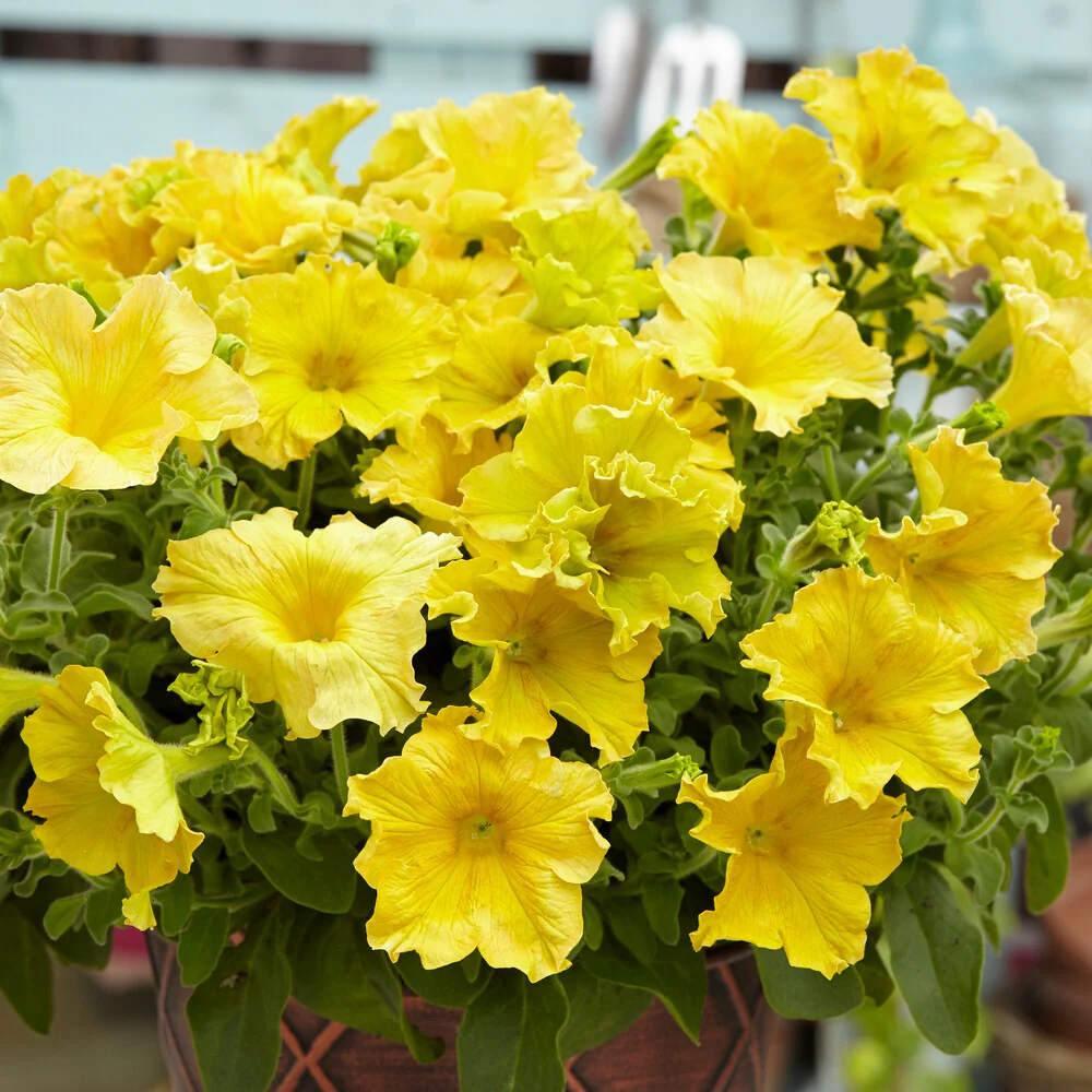 Autre idée plus simple, mais tout aussi efficace : associez vos Géants Jaunes à d’autres variétés de pétunias. Certaines présentent des combinaisons très intéressantes de pétales bicolores. D’autres, comme les pétunias ondulés, sont parfaits pour agrémenter les suspensions et les jardinières. Lorsqu’ils sont cultivés en masse, leur port traçant permet de créer de magnifiques cascades de couleurs. Toutes ces variétés de pétunias offrent, au même titre que les Géants Jaunes, la même floraison abondante et durable en été.
