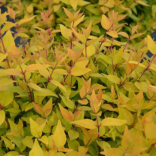 Celle-ci s’étend sur environ 1 m de diamètre. Ainsi, elle peut offrir un effet compact et très touffu grâce à son port buissonneux. Cette plante possède de feuillage semi-persistant richement coloré. Et ces feuilles ovales et pointues sont tantôt vertes puis jaunes, orange et cuivrées. Cela donne, une apparence constamment changeante, pour le plaisir des jardiniers grâce à sa coloration variée évoluant avec les saisons et les conditions climatiques.