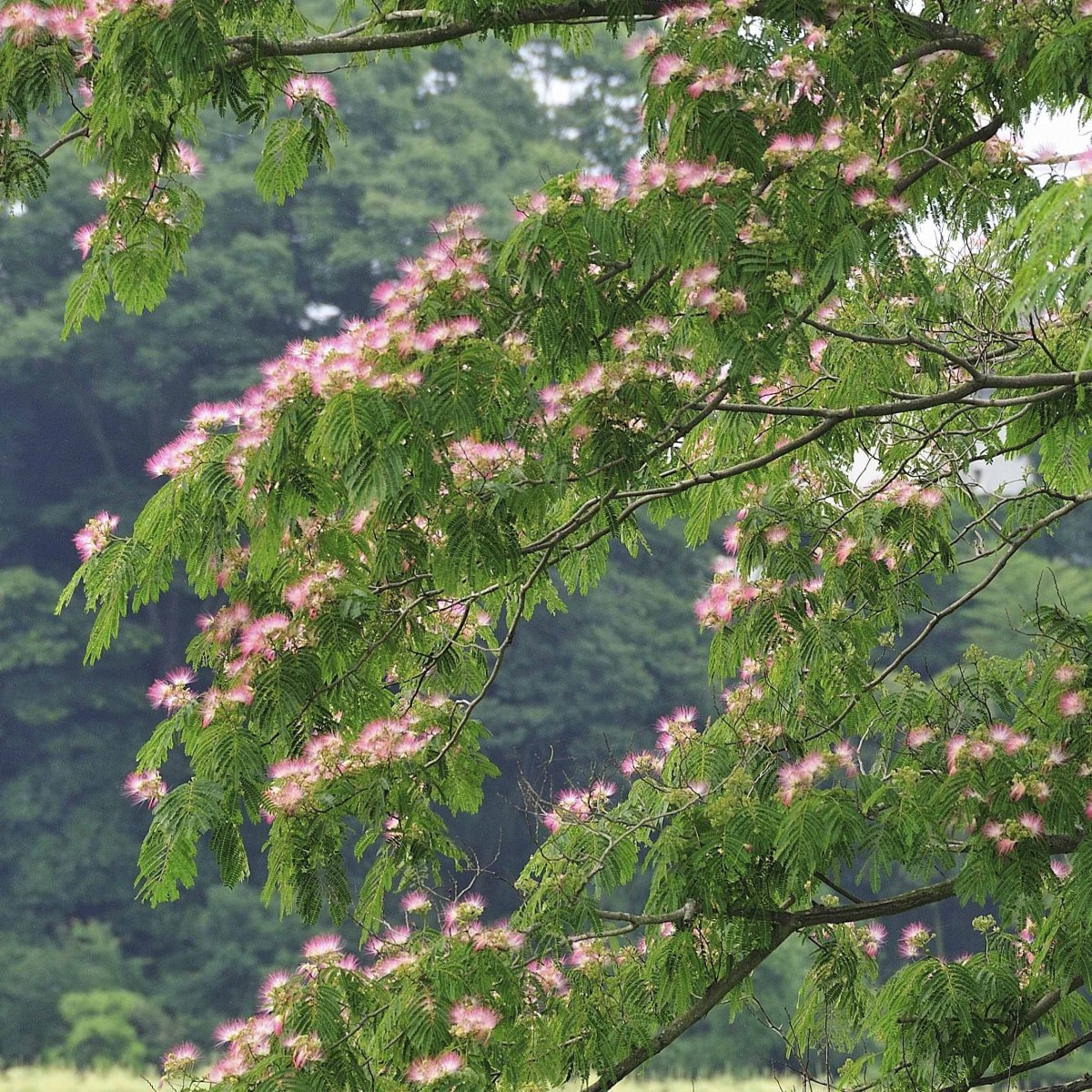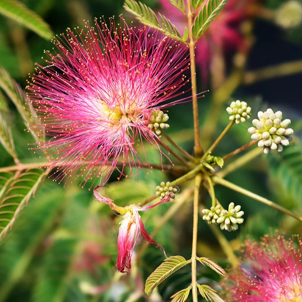 Quand il fleurit, l’albizia julibrissin devient majestueux avec ses bouquets de grappes de minuscules fleurs identiques aux aigrettes. Les fleurs sont composées d’étamines de coloris blanc rosé qui garantit un excellent effet soyeux et vaporeux. Mise en valeur par le feuillage, la floraison se renouvelle en abondance de juillet à septembre. Les feuilles décoratives se replient sur elles-mêmes la nuit et se présentent en un ensemble de plusieurs petites folioles de teinte verte intense comme les feuilles de mimosa.