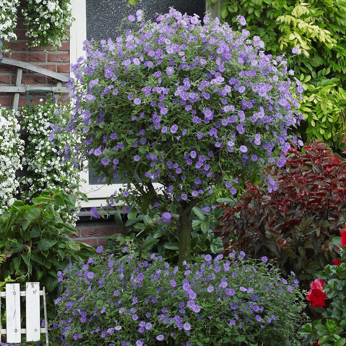 Solanum Rantonetti, ou l’arbre aux gentianes, est l’un des types de plante les plus prisés pour un magnifique spectacle estival. Cet arbuste compact, également appelé « Paraguay nightshade », est idéal en tant qu’Arbustes de balcon. Originaire d’Amérique du Sud, il enchante par ses fleurs violettes lumineuses durant toute la belle saison, transformant ainsi n’importe quel balcon en une oasis colorée. Résistant et décoratif, il demande cependant une exposition soignée et un sol bien drainé pour révéler toute sa splendeur.