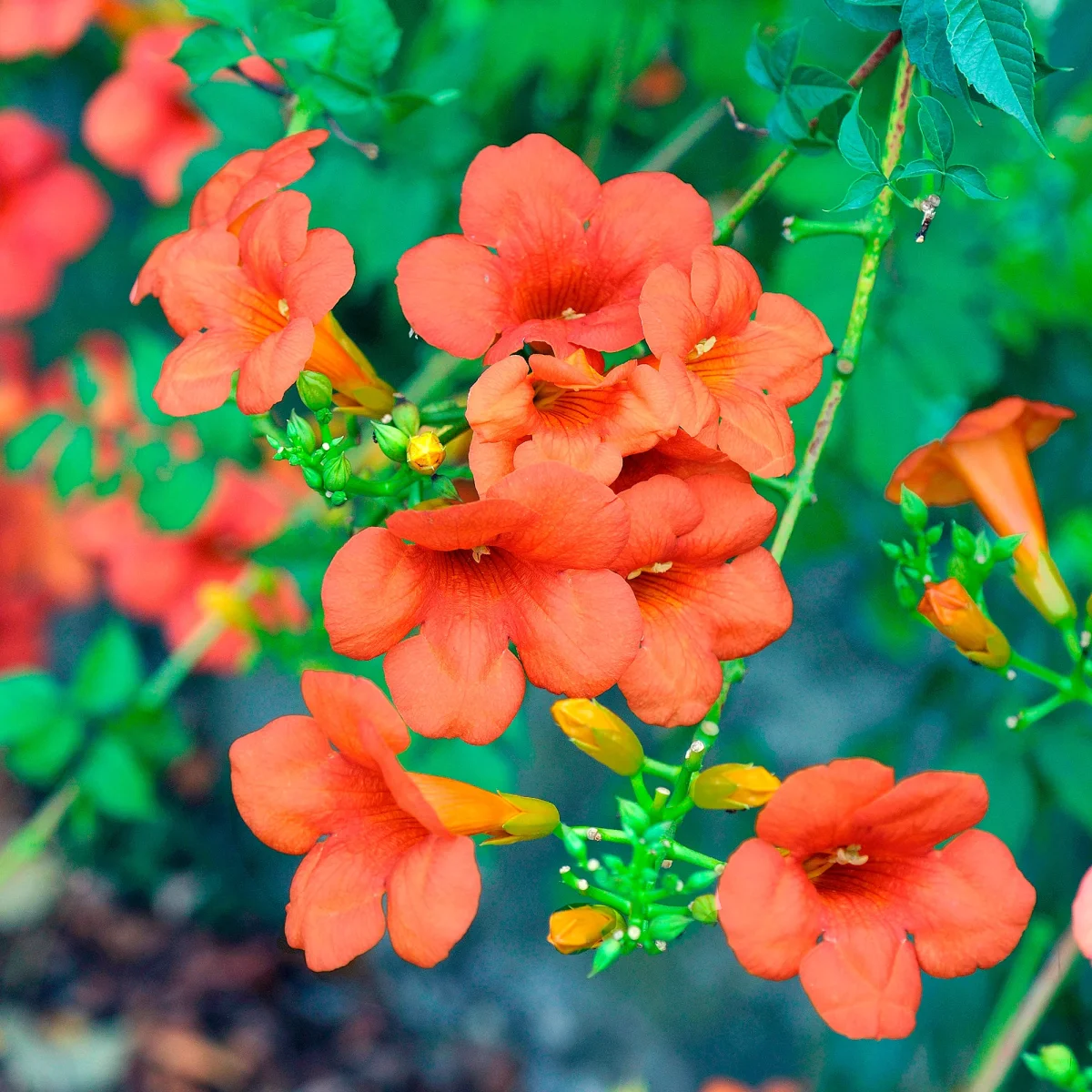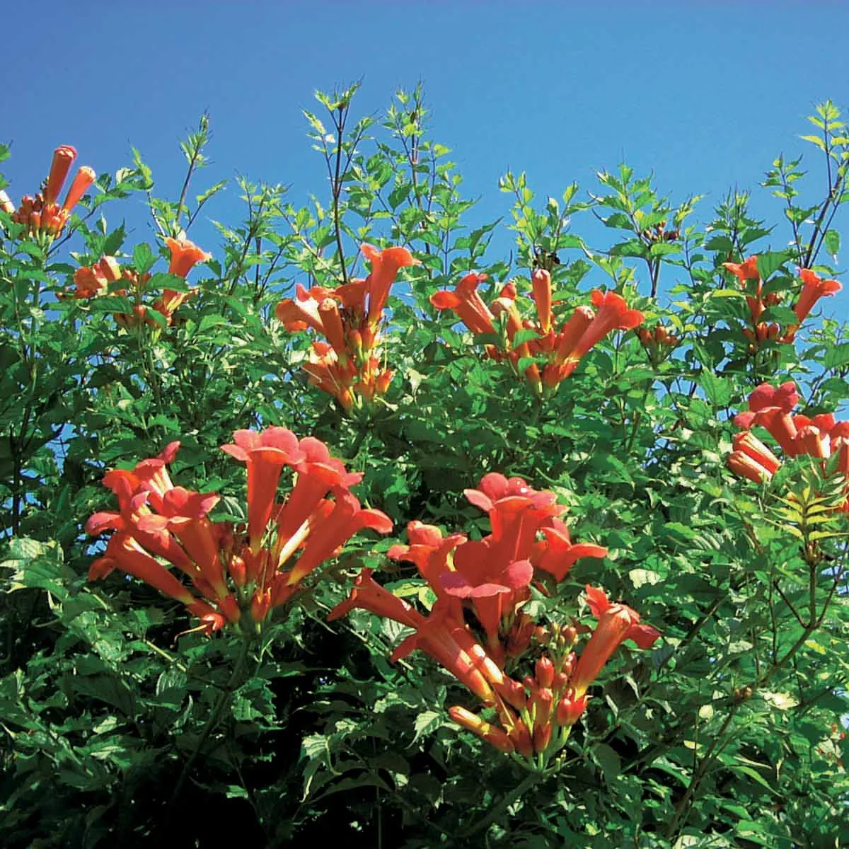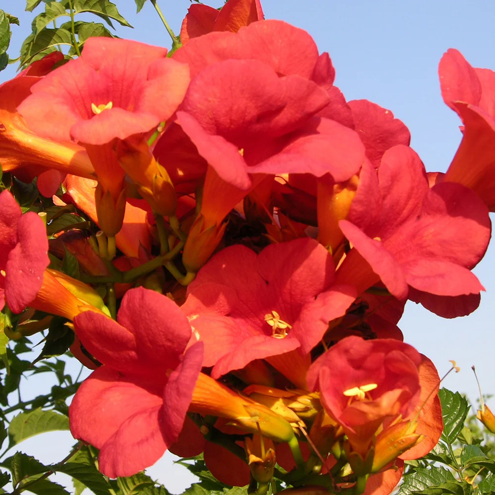 La bignone Campsis Tagliabuana Madame Galen est une plante grimpante appartenant à la famille des bignoniacées. Elle est caractérisée par sa croissance rapide et vigoureuse. Ses racines aériennes lui permettent de s’accrocher à tout support. C’est donc un produit idéal pour décorer vos murs, tonnelles, treillis, et plus encore. La floraison de la bignone a lieu en été. Elle est marquée par de nombreuses fleurs rouges en forme de trompettes.