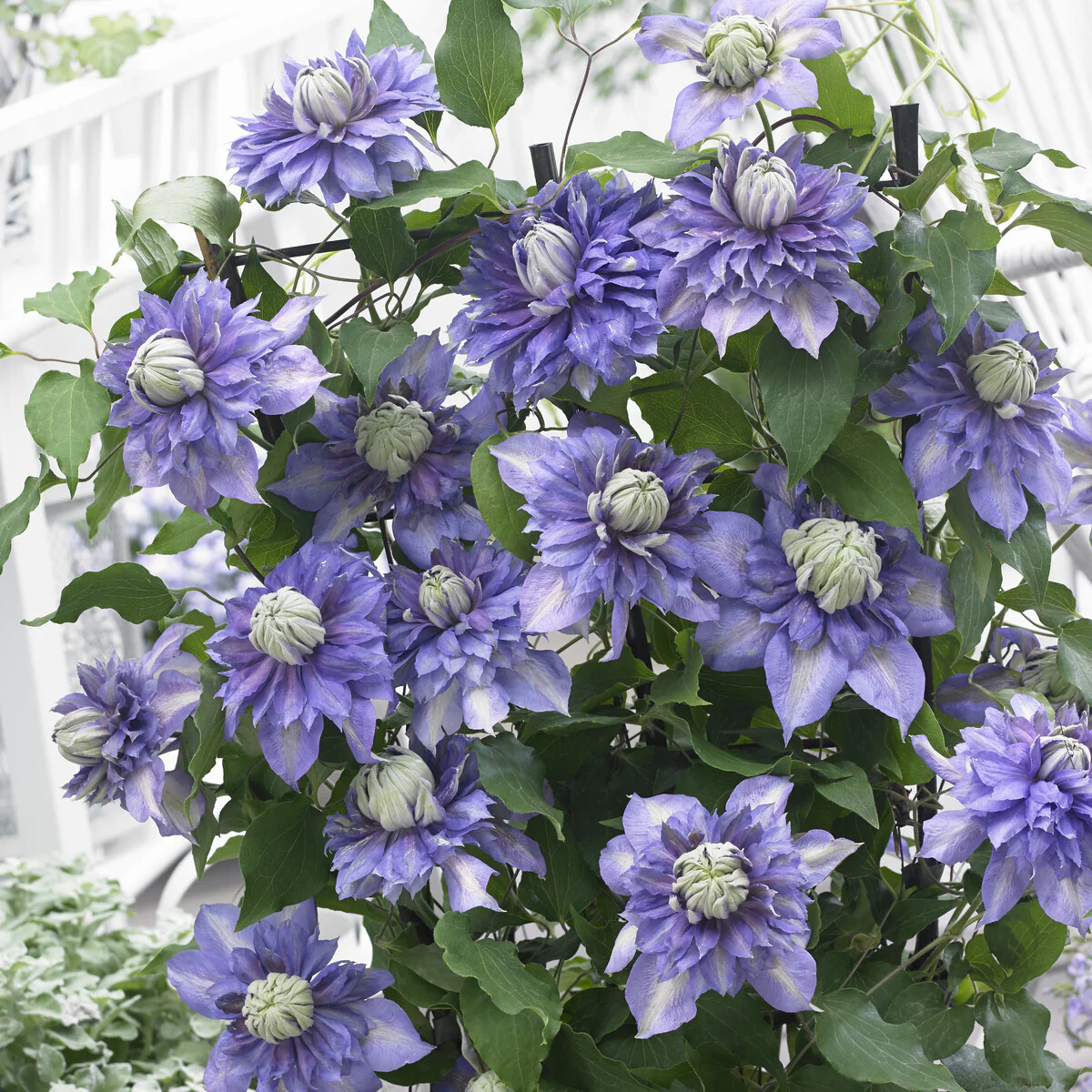 La Clématite Diamantina Evipo 039 est composée de fleurs doubles regroupées en grappes fournies, ainsi que des pétales teintés de violet intense. Elle s’épanouit entre la fin du printemps et l’automne.