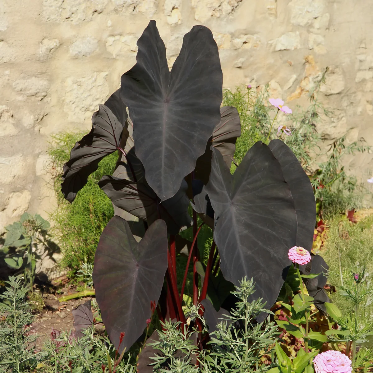 La Colocasia Black Magic se distingue par ses feuilles larges en forme de cœur, pouvant atteindre un mètre de longueur. La couleur pourpre-noir de ses feuilles varie subtilement selon l’intensité lumineuse, captivant l’observateur par ses nuances profondes et chatoyantes. Son port élégant, avec des tiges robustes et élevées, ajoute une dimension verticale qui complète efficacement les plantes à croissance plus basse dans le jardin. Cette plante tropicale est vivace dans les régions où le climat est favorable, bien qu’elle puisse être cultivée comme annuelle dans des climats plus tempérés. Ses racines tubéreuses stockent l’eau et les nutriments, permettant à la plante de résister aux périodes de sécheresse relative. En termes de croissance, elle nécessite un sol riche et bien drainé pour s’épanouir, condition indispensable à l’obtention de grands feuillages sains.