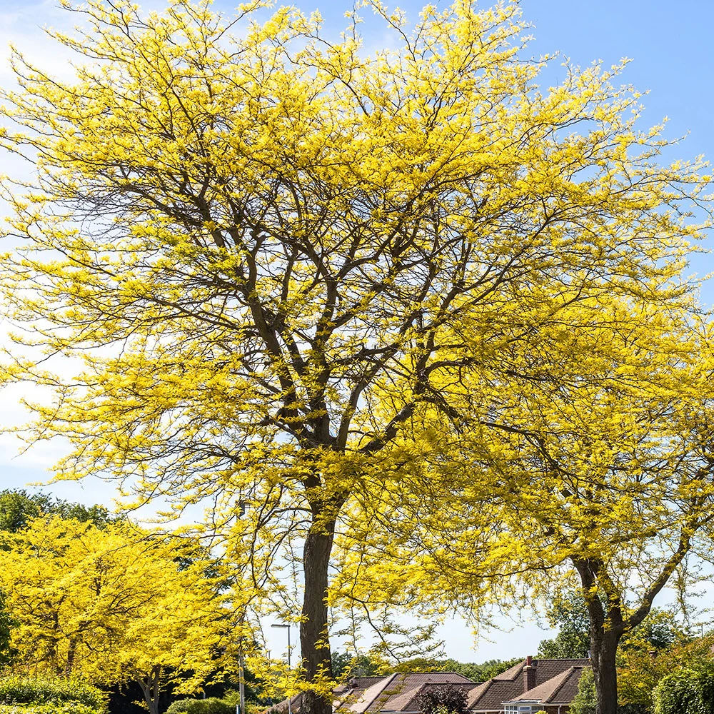 La variété sans épines ‘Sunburst’ (Gleditsia triacanthos ‘Sunburst’) peut atteindre environ 12 m à l’âge adulte (voire plus dans des conditions favorables) et a une envergure d’environ 10 m. Il est léger et élégant, résistant à la sécheresse et à la pollution, ce qui en fait un choix parfait pour les jardins urbains. De plus, il ne craint pas les inondations temporaires. En été, il produit de petites fleurs verdâtres en grappes. Celles-ci attirent les insectes butineurs et favorisent la biodiversité. À l’automne, l’arbre produit des fruits. Les gousses longues et aplaties renferment une pulpe sucrée que l’on peut manger.