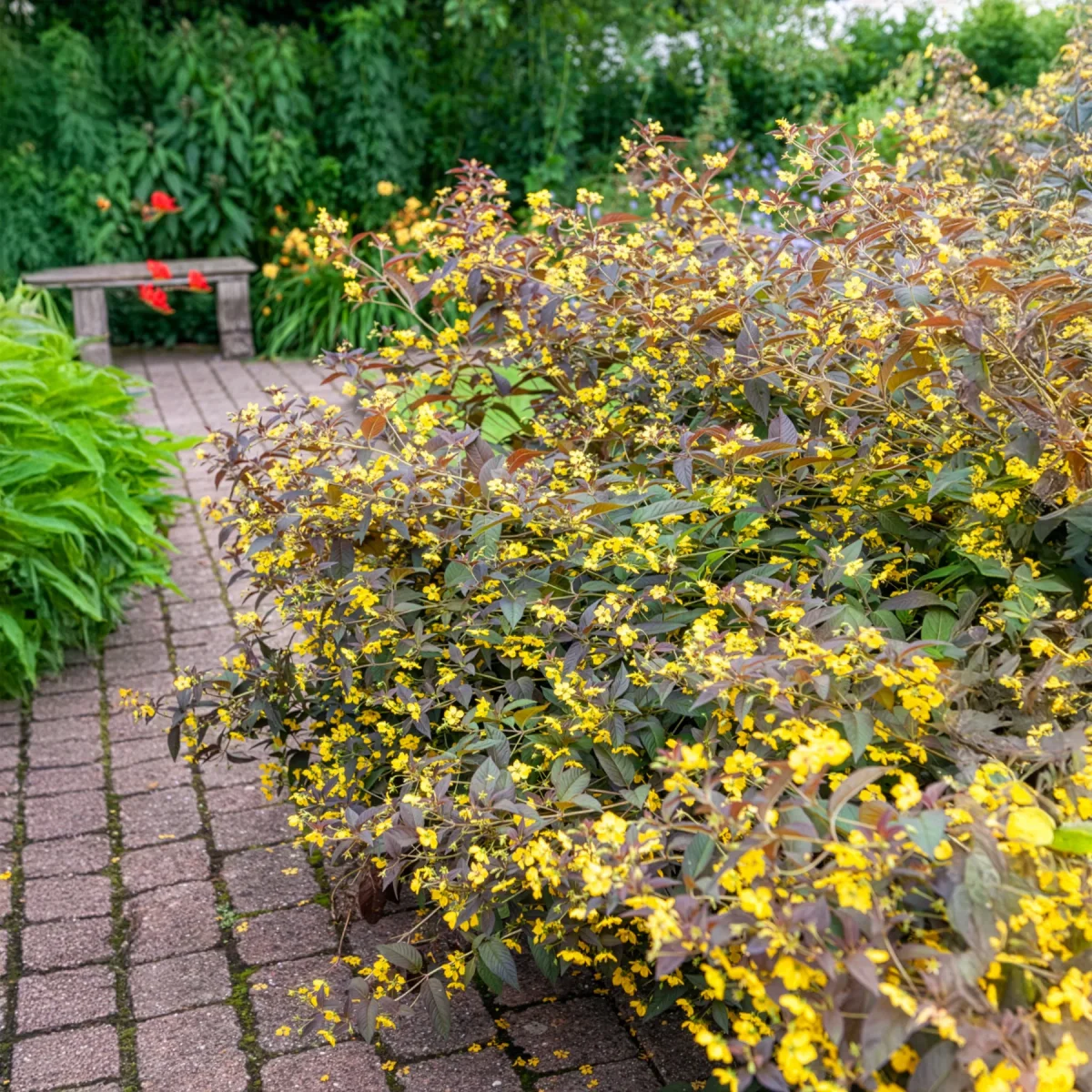 - Floraison ou intérêt principal : floraison en petites étoiles jaune vif, groupées en épis ou grappes terminales. La période de floraison se situe le plus souvent entre fin juin et juillet selon la région, parfois un peu plus tôt en climat doux. L’intérêt principal reste le contraste feuillage sombre/fleurs claires, et le feuillage décoratif une grande partie de la belle saison.
