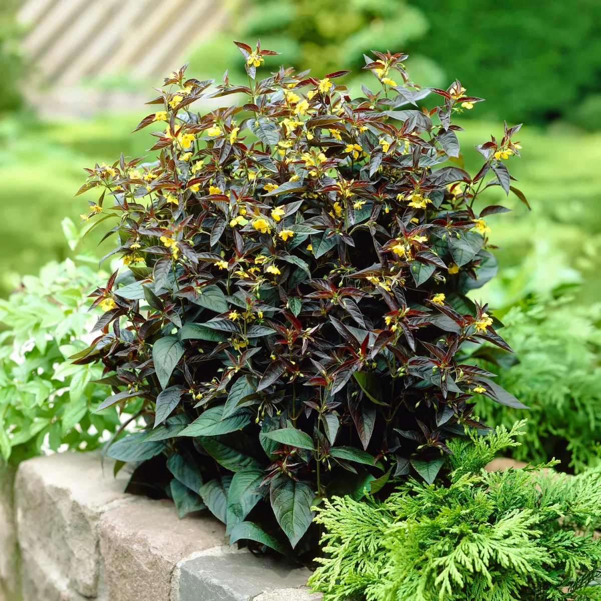 Cette vivace forme une touffe dressée, composée de tiges souples, souvent rouge brun, portant un feuillage ovale à allongé, opposé sur la tige. En début de saison, le feuillage est généralement très sombre, presque chocolat, puis il peut se nuancer de vert bronze au fil de l’été selon l’ensoleillement. En fin de printemps ou en été, un épi terminal de petites fleurs étoilées jaune d’or apparaît au sommet des tiges, créant un contraste net avec le feuillage.
