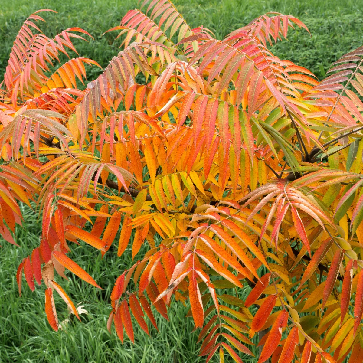 Le sumac de Virginie, du nom scientifique Rhus typhina, est un arbre caduc de la famille des anacardiacées. Il est originaire des régions de l’est de l’Amérique du Nord. Planté dans de bonnes conditions, il peut atteindre une hauteur de 6 m. Ses jeunes tiges sont rouges et veloutées, mais deviennent ligneuses au fil du temps. Il est caractérisé par un feuillage vert foncé et ses feuilles peuvent atteindre une longueur jusqu’à 50 cm. Ce sont des feuilles alternes et pennées, constituées de 20 à 30 folioles oblongues, lancéolées et aux bords dentés. En automne, elles virent à l’orange vif en automne.