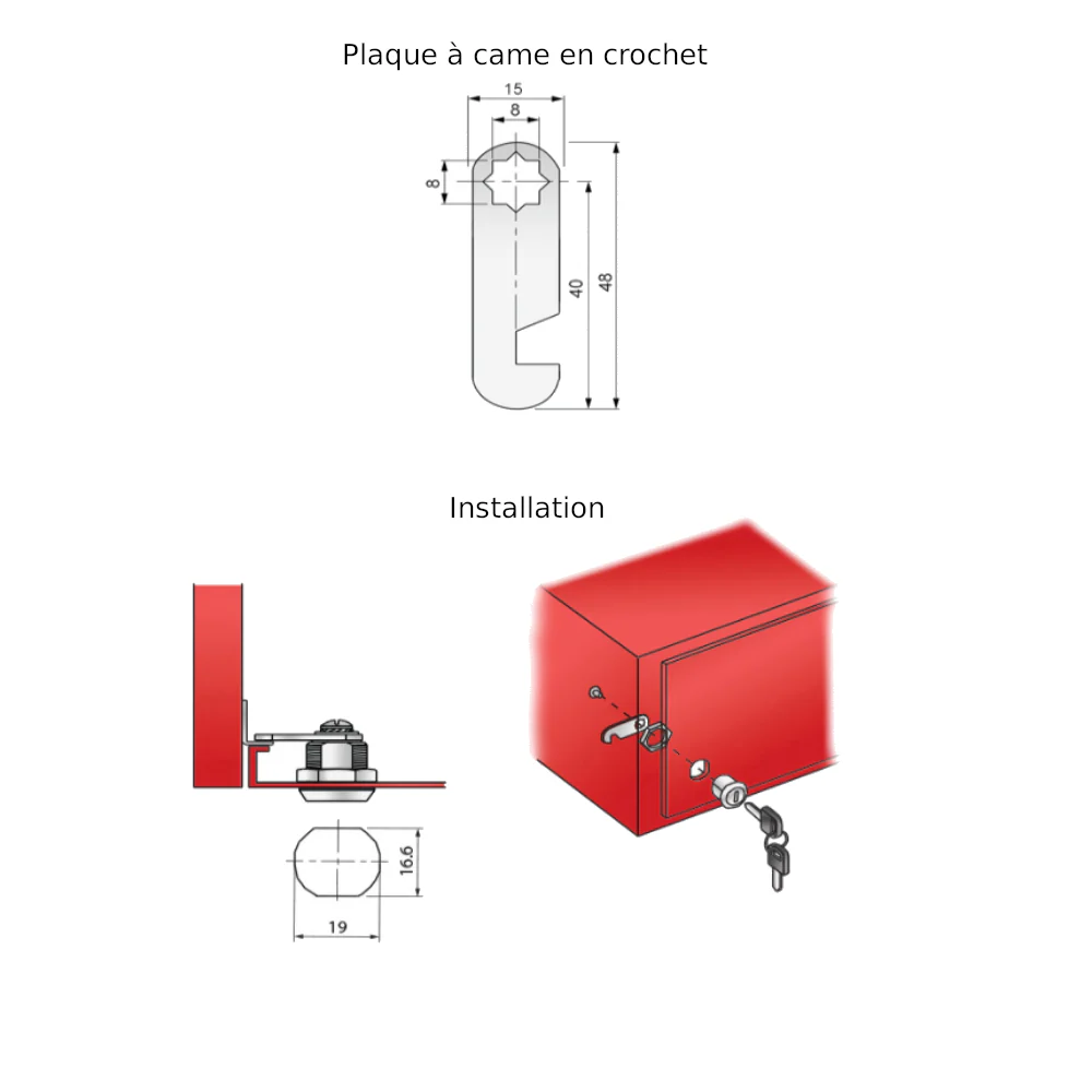 Verrou de boîte aux lettres avec plaque à came à crochet 19x20mm, chrome